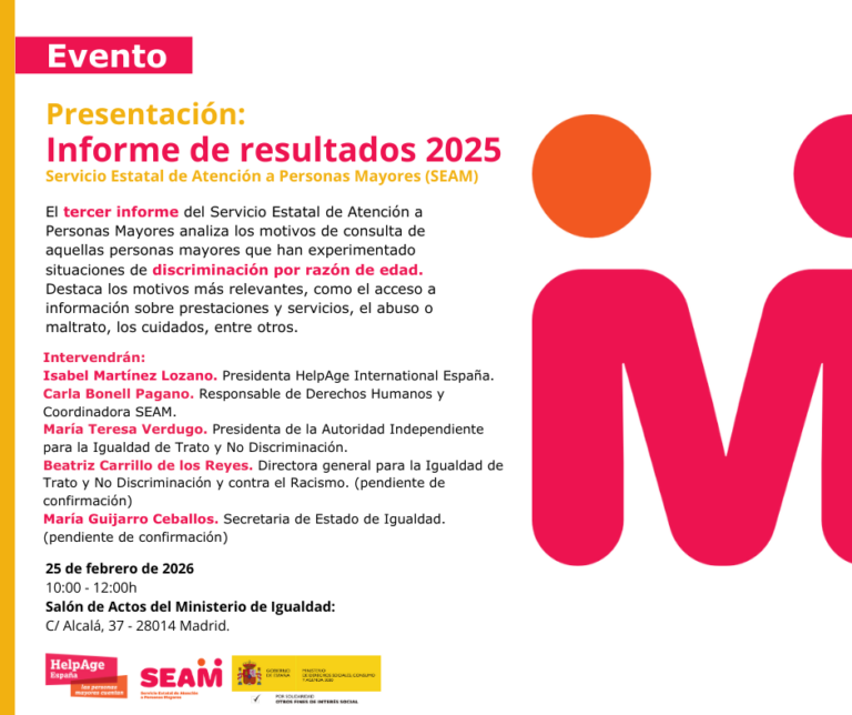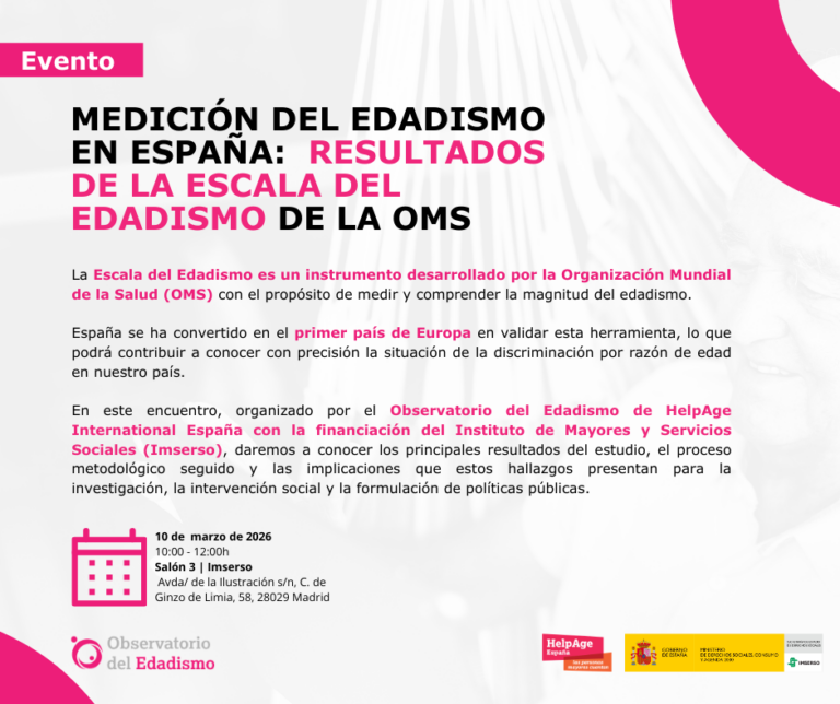 La Escala del Edadismo es un instrumento desarrollado por la Organización Mundial de la Salud (OMS) con el propósito de medir y comprender la magnitud del edadismo. España se ha convertido en el primer país de Europa en validar esta herramienta, lo que podrá contribuir a conocer con precisión la situación de la discriminación por razón de edad en nuestro país. En este encuentro, organizado por el Observatorio del Edadismo de HelpAge International España con la financiación del Instituto de Mayores y Servicios Sociales (Imserso), daremos a conocer los principales resultados del estudio, el proceso metodológico seguido y las implicaciones que estos hallazgos presentan para la investigación, la intervención social y la formulación de políticas públicas.