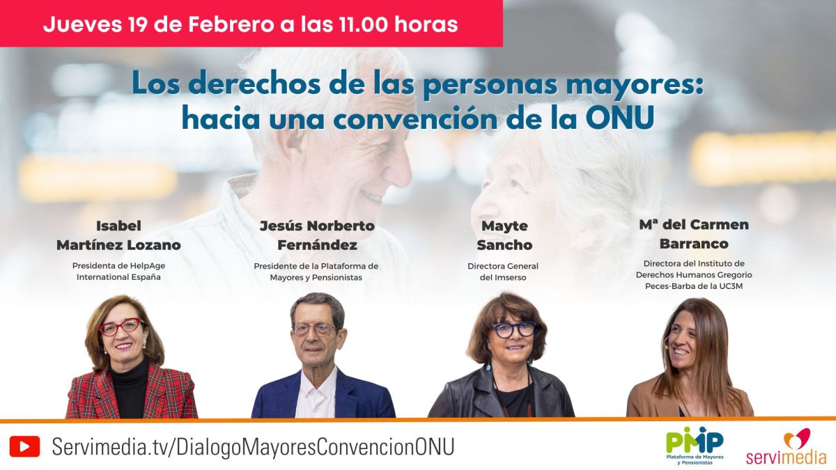 El director general de Servimedia, José Manuel González Huesa, moderará la conversación con varios expertos como el presidente de la Plataforma de Mayores y Pensionistas, Jesús Norberto Fernández; la directora general del Imserso, Mayte Sancho; la presidenta de HelpAge International España, Isabel Martínez; y la directora del Instituto de Derechos Humanos Gregorio Peces-Barba en la Universidad Carlos III de Madrid, María del Carmen Barranco.